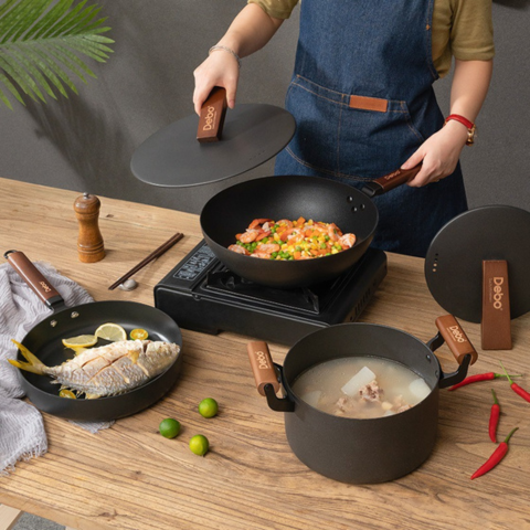 Conjunto de 2 Ollas y 1 Sartén Antiadherente en Acero Inoxidable con Mangos de Madera